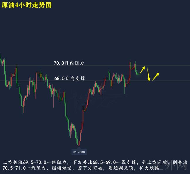 原油技术分析来分析,日K线上,星期五原油在经历星期四的上涨后,展开回踩,盘中报得带上影线的中阴,日K线上,即使原油价格在星期五收盘下跌,但底部均线支撑仍未突破,仍有机会又一次持稳上涨;4小时上,星期五原油短暂持于高点盘整后展开震荡下探,盘中跌向中轨,目前布林带处在开口期,MA均线迈出死叉,KDJ随机指标三线并拢朝下,到达超买,MACD指标绿色量能柱开始显现,快慢线死叉朝下,综合来说,原油当前恐会跌向日K线均线支撑又一次上升,下星期一交易参考高空低多,上方注意69.5-70.0一线压力,以下注意68.5-69.0一线支撑,若行情上方显现击穿,则注意70.5-71.0一线压力,若以下显现击穿,则短时间到顶增速下探。