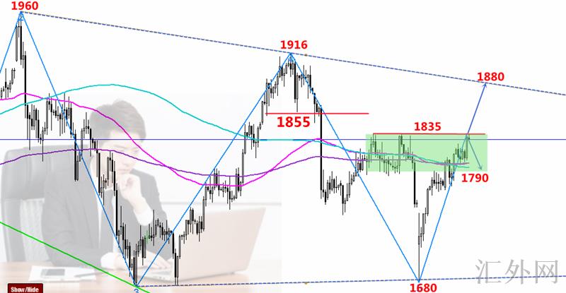 黄金前期遇阻1834双顶回调,一路疯狂下探到1680名置,随后刷新1680低点形成三次摸底又一次面临了接连性的回弹回归了1800上方运行。受非农大幅有好处多头刺激下,黄金峰回路转重返1834高点,收回以前所有降幅,买方情绪爆棚。当前着重就是1834左右阻力,此位置正是1916—1680斐波那契回踩61.8%位置,也是以前双顶阻力点,若是有效击穿此位那么黄金如虎添翼将增速上涨到1855左右试探,而1960—1916的下探通道抑制线在1880左右。反来说之若是无法击穿此位又一次遇阻回调的话,那么任然回归1835—1790区间执行震荡。然而从目前行情与买方情绪来说,预计是要击穿1835高点的,毕竟日K线呈连阳震荡上涨,MA5-MA10维持金叉之势上涨,布林带上缘有往上开口运行态势;周线上锤子线反抽回涨连阳回弹代表以下做多盘较重奠定了买方上涨基础,在以前李鸿彬就强调这周看多,尽管历经了反复过山车洗盘,然而最终依旧按计划上升。那么当下操作以回踩入多为主,上方着重注意1835左右阻力,以下注意1820左右支撑。