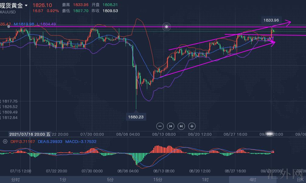 受非农就业报告爆冷的影响,星期五夜里黄金大阳推涨最高刷新1833.9左右,星期五美盘亚盘四小时以大阳报收。从形态来说,黄金日K线级别呈阶梯式上升,上升修正再上升,形态上偏多,但星期五刷新的高位刚好刷新前期双顶抑制回调,四小时的单价也以及到达上涨通道上缘抑制左右,技术指标接连性背离,买方的上涨任然举步维艰,短时间仍看看不足黄金极强,交易参考上审慎追多。