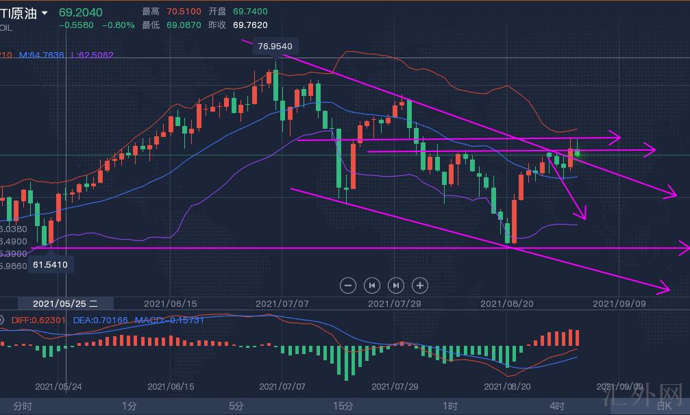 下星期一思路、手中持有星期五美盘安排70空持续持有,无单的69.5-69.6空即可,短时间以下支撑69左右四小时布林带中轨支撑,星期五凌晨走软星期一贯下击穿机会比较大,价格一旦朝下击穿68.2预计这短时间行情走软,诚然能不能打开以下空间,后期核心仍需要看67左右支撑。