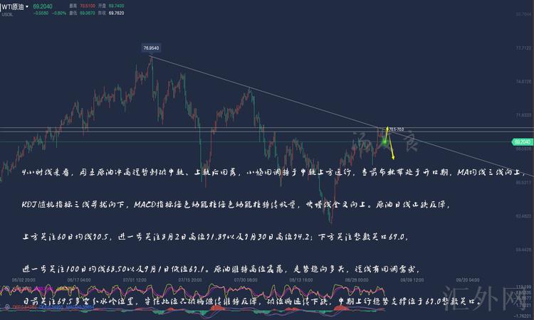 日K线来说,星期五原油震荡调动后冲顶回调,并跌向MA10日移动均线后回涨,报得带上下影线的阳线,行情持于MA5日移动均线上方运行,恐会持续依托MA10日移动均线上升。4小时来说,星期五原油冲顶短暂刺破中轨、上缘后回调,适当回踩持于中轨上方运行,目前布林带处在开口期,MA均线三线往上,KDJ随机指标三线并拢朝下,MACD指标绿色量能柱绿色量能柱连续放量,快慢线金叉往上。原油日K线止跌回弹,上方注意60日移动均线70.5,更深一步注意8月2号高点71.89以及7月30号高点74.2;以下关注整数关键点位69.0,更深一步注意100日移动均线68.50以及9月1号低点67.1。原油保持高点震荡,行情趋向买方,短线有回踩需求,当前注意69.5多空分界线位置,守稳此位不破将持续保持回弹,突破将保持下挫,中期上涨趋势支撑点于67.0整数关键点位。