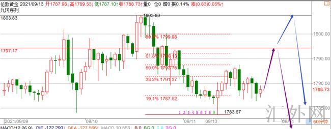 星期一(9月13号)早盘收盘,黄金现货平和回弹,早盘亚盘黄金价格最多跌向1785美元每盎司以下。随后到1783以下逐渐回弹到1793高位,截至到当前欧盘持续保持在1790左右整顿。