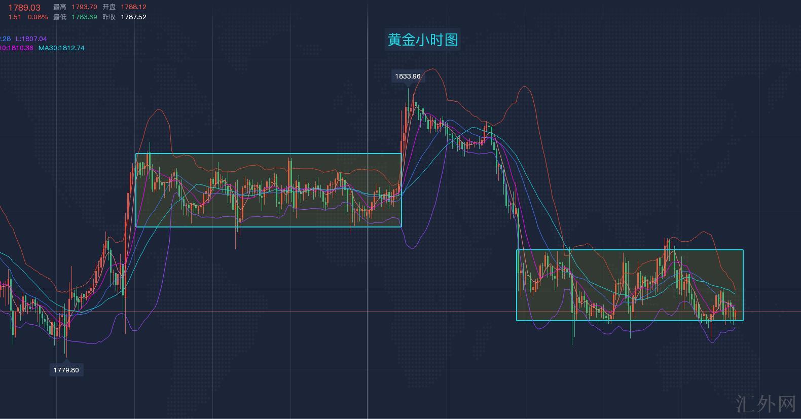 从1小时来说,伴伴随黄金价格的整理,布林开始缩口运行,黄金价格沿着布林中轨展开攻防,MA5下穿10日移动均线朝下发散,中轨于1790形成短线抑制,附图指标MACD金叉能量减弱殆尽,KDJ、RSI均聚合朝下发散,晋廷觉得小时线同样呈现震荡偏空行情。