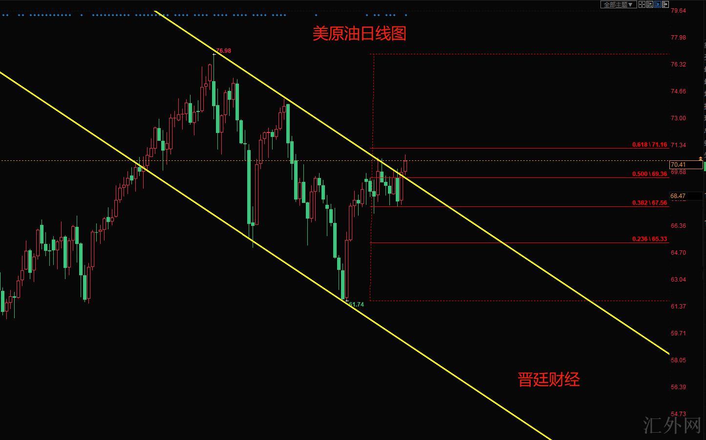 上方初始压力注意61.8%回撤位71.17,更深一步注意8月3号高点71.94及76.4%回撤位73.39。以下初始支撑注意50%回撤位69.37,更深一步注意3月8号高点67.98以及5月8号高点67.01。