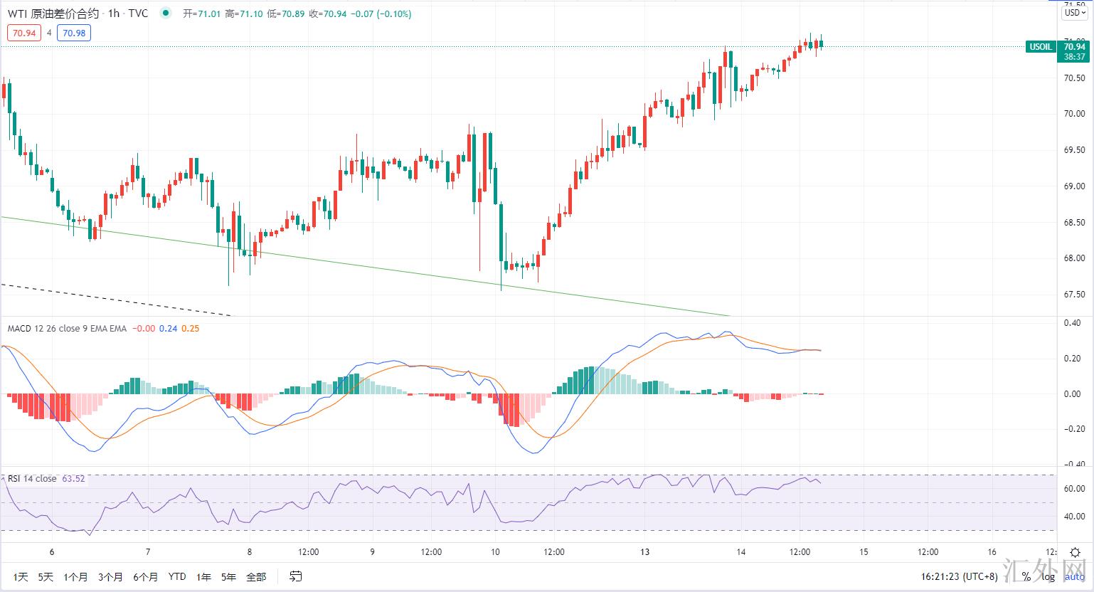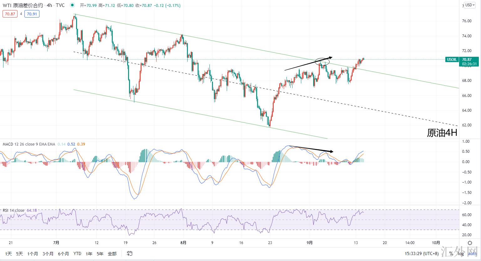 在现阶段,买跌不可取,追多也不适宜,诚然,假使你像我一样有低点多单的,可以追。对于原油空仓的人来看,现阶段,最重要的是不要被原油连续的慢涨闹得丧失信心,这就是在明目张胆的挑逗你,即便原油小时级别后市经历推涨后面超买了,但是回调程度不大,到时你再进场,也比当下追多阻力小的多,可以着重关注原油以下70.5-70.2的支持!