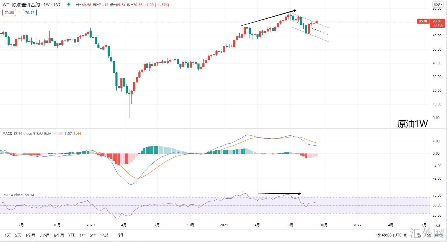 先来说原油的周线,原油从去年4月份的闪跌后面一路回弹,最高在今年7月初刷新了76.8的核心抑制位,76.8是原油有记录以来重要的多空反转点,随后开始下挫,那原油下挫要搞清楚,为何下挫?下挫是属于调动依旧趋势的更改?原油刷新76.8的核心抑制,再加之RSI的顶背离,所以开始的下挫,但是MACD快慢线却没有很显著的到顶形态,更核心是月线的K线来说,并无反转K线,MACD快慢线迟缓发散,RSI运行不错,并无趋势反转的痕迹,所以周线的下挫大约率导致一次调动。