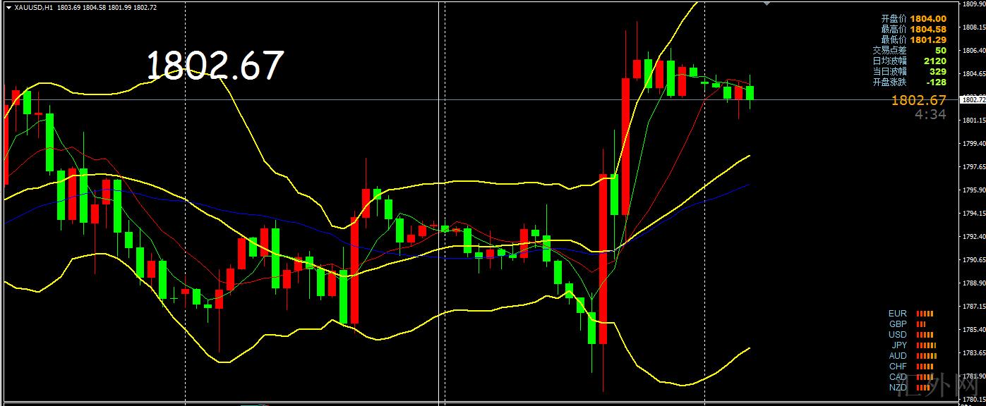 美市收盘,黄金现货收报得1804.34美元每盎司,上升10.88美元或0.61%,盘中最高刷新1808.48美元每盎司,较日低1780.55美元每盎司最多推涨28美元。