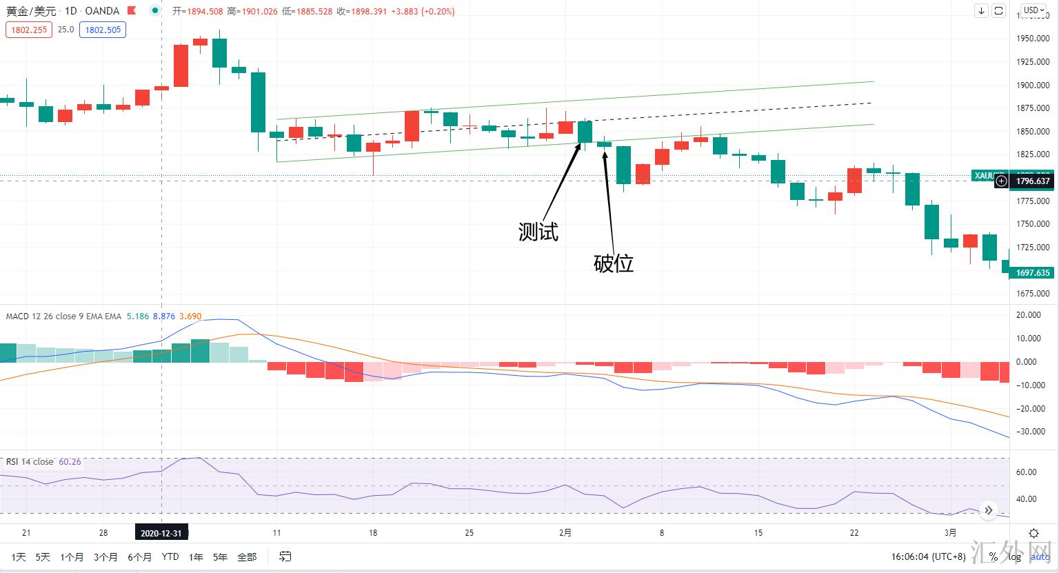 这是黄金日K线,图中黄金迈出了一个上涨通道,图中我已经标示出来了,黄金已一根大阴线来试探通道下缘支撑,而且是实体试探,实体是刚好试探到通道下缘,后面第二根K线的收盘价收在了通道下缘的以下,证实突破!可以进场买跌!