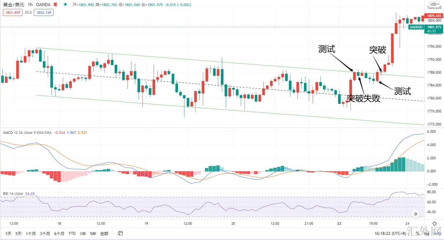 再来说一个失利的例子,黄金小时图,图中有一个下探通道,黄金上升,以一根阳柱完成对下探通道上缘的试探,但是第二根K线在上缘的抑制下,收了一根阴线,收盘价在通道上缘的以下,击穿失利!