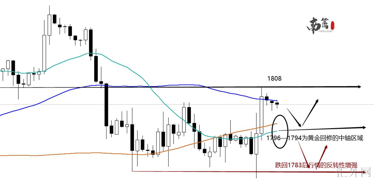 在日间思路上着重的关注倒不是小时图中的压力,就像我今天早间解析的,黄金当前是区间1804—1783的虚破正要历经回踩,在这其中需求注意上涨趋势回修一下再直接拉涨的情形。在长下影线的助推下,白盘大约率是要居高震荡的,区间大差不差是1798—1808十美金。