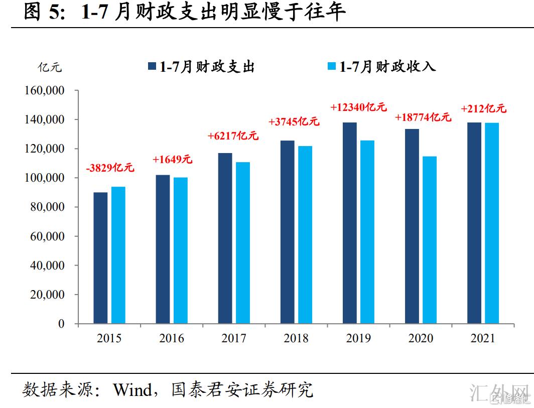 2021年1-7月财政开支仅略好于财政收入212亿元,以往5年1-7月财政开支好于财政收入的均值为8545亿元,上半年财政开支节奏显著慢于往年。9月以后财政集中花钱效应当会越来越强,下半年财政开支对资金面有支撑,这也更深一步减轻了货币政策的对冲阻力。