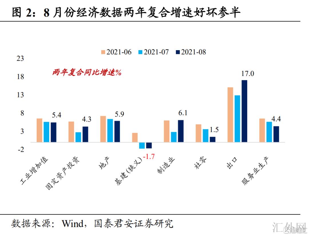 随后发布的经济报告好坏参半:固投、制造业、出口两年复合增速分别为4.3%、6.1%、17.0%,较7月分别环比提高1.5、3.3、4.2个百分点;工业增长值、地产投资、社零两年复合增速分别为5.4%、5.9%、1.5%,环比分别回调0.2、0.5、2.1个百分点;狭义基础设施建设两年复合增速-1.7%,打平于7月,广义基础设施建设增速从-1.6%回涨到0%。
