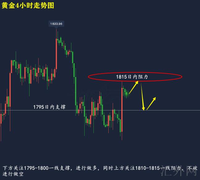 黄金技术分析来分析,日K线上,隔日黄金先跌后涨,盘中刺破MA5日移动均线后回涨,并转头刺破MA10日移动均线后适当回调,报得带上下影线的中阳,日K线上,今日行情展开回撤,预期会依托MA5日移动均线上升;4小时上,隔日黄金开盘下挫刺破下缘后回涨,并击穿上缘后展开回踩,目前布林带处在开口期,MA均线迈出双金叉,KDJ随机指标三线向前,到达超买,MACD指标红色量能柱连续放量,快慢线金叉往上,综合来说,黄金当前短时间仍有回撤,待回撤到支撑后恐会又一次上升,日间交易参考回撤买涨,以下注意1795-1800一线支撑,同期上方可注意1810-1815一线压力,不破执行买跌,若以下显现无意中下挫,则再注意1785-1790一线支撑执行买涨。