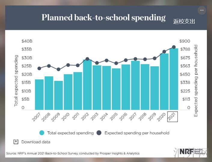 同期,美国零售联合会预期,图表中蓝色柱代表的是总开支,而折线代表的是每个家庭预期开支,可以目睹,有孩子的家庭规划在学校用品中平均花费848.9美元,有大学生的家庭规划平均花费1200.32美元,该数据都好于去年的家庭支出,诚然我认为这也由于去年房价还没这么贵,芯片也没这么贵致使的,但这不重要,重要的是,民众有务必要花钱的理由。