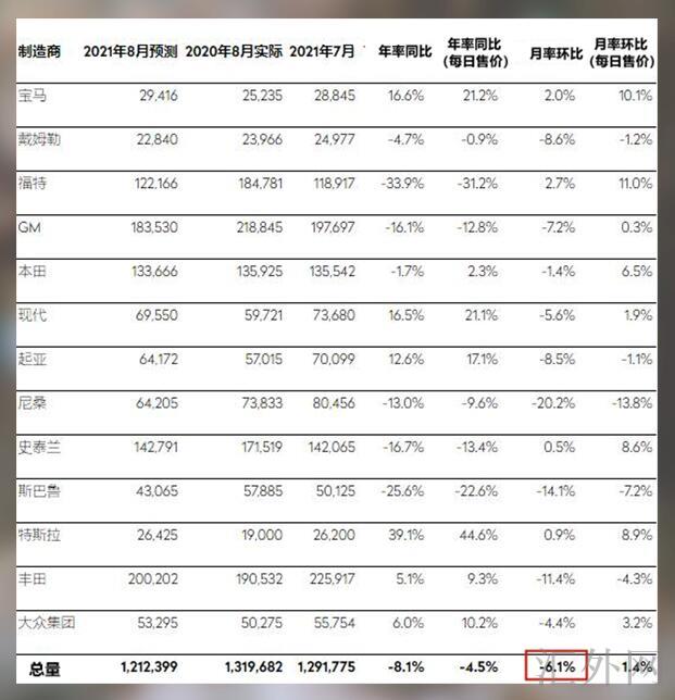 目睹图中红框部分给出的月率改变,也就是说,预期8月对比7月的销售额下滑了6.1%,既然销售额都下滑了,销量自然也就好不足哪去,而他们预期的二手车销量却比较高,跟去年同期对比上涨6%,同期也好于7月,看来芯片匮乏尽管压抑了新车的销售情形,但却持续推升了二手车市场的热门。