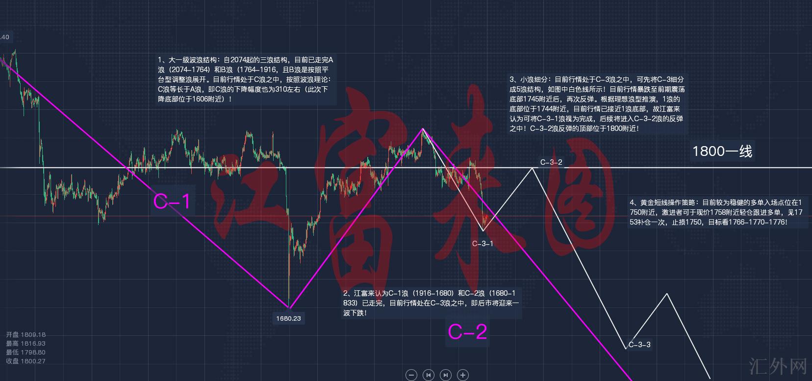3、小浪细分:当前行情处在C-3浪当中,可先将C-3细分成5浪结构,如图中白色线所示!当前行情痛跌至前期震荡底部1745左右后,又一次回弹。依据理想浪型推演,1浪的底部位于1744左右,当前行情已接差不多1浪底部,故江富来觉得可将C-3-1浪看为完成,后续将进入C-3-2浪的回弹当中!C-3-2浪回弹的顶部位于1800左右!