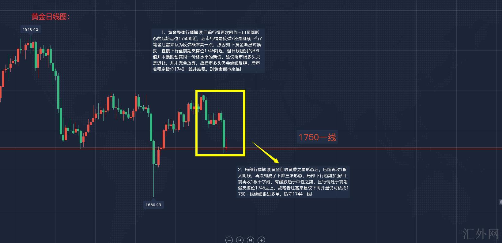 1、黄金整体行情注解:当前行情又一次回归三山顶部形态的起始点位1750左右,后市行情是回弹?依旧持续下探?笔者江富来觉得回弹几率高一点,原因如下:黄金断层式痛跌,直接下探至前期支撑点1745左右,但日K线级别的RSI值仍未痛跌创其同一价格水平的新低,这表明市场买方导致退让,仍未完全放弃,故后市买方仍会持续回弹。后市若平稳突破1740一线并立住,则黄金熊市到来!