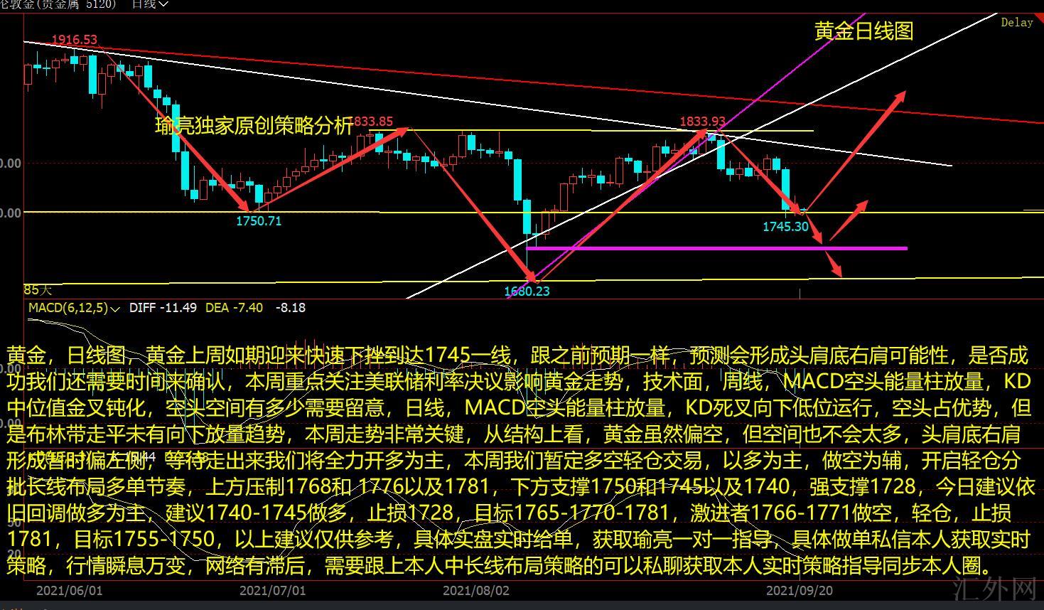 黄金,日K图,黄金上周按计划面临迅速下跌到达1745一线,跟以前预计一样,预期会形成头肩底右肩机会,能否成功我们仍需要时间来证实,这周着重关注美联储利率会议影响黄金行情,技术分析,周线,MACD卖方能量柱放量,KD中位值金叉钝化,卖方空间有多少需求留心,日K线,MACD卖方能量柱放量,KD死叉朝下低点运行,卖方占优势,但是布林带走平未有朝下放量趋势,这周行情异常核心,从结构向上瞧,黄金尽管看空,但空间也不会太多,头肩底右肩形成临时偏左侧,等候迈出来我们将全力开多为主,这周我们暂定多空轻仓交易,以多为主,买跌为辅,开放轻仓分批长线布局多单节奏,上方抑制1768和 1776以及1781,以下支撑1750和1745以及1740,强支撑1728,今日推荐依旧回踩买涨为主,推荐1740-1745买涨,止损1728,计划1765-1770-1781,激进派1766-1771买跌,轻仓,止损1781,计划1755-1750,以上推荐仅供参考,具体实盘实时给单,获取瑜亮一对一指导,具体做单私信本人获取实时策略,行情瞬息万变,网络有落后,需求跟上本人中长线布局策略的可以私聊获取本人实时策略指导同步本人圈。