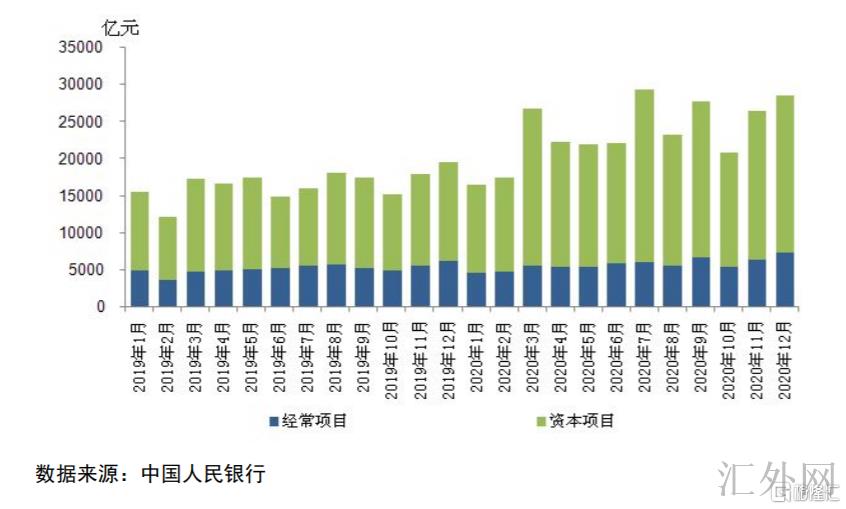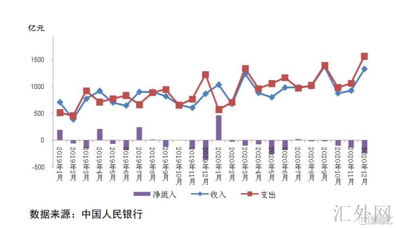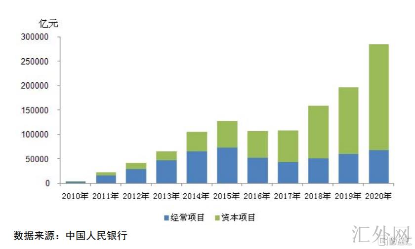 2020年,人民币跨境运用呈现稳健上涨态势,人民币在本外币跨境收付中的占比刷新高峰,收支总的平衡,整体呈适当净流出局势。