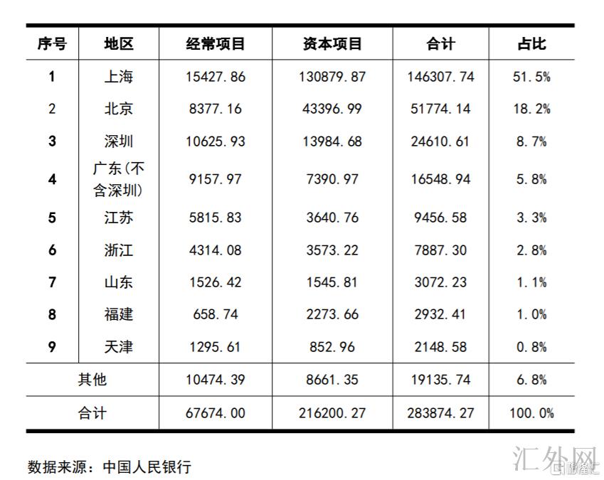上海、北京、深圳人民币跨境收付量持续位列全国前三名。2020 年,三地人民币跨境收付金额分别占全国人民币跨境收付总额的 51.5%、18.2%和 8.7%。2020 年,全国共有9个省(区、 市)人民币跨境收付金额胜过2000 亿元,8个边境省、自治区收付金额合计为5525.57 亿元,同比上涨 14.3%。