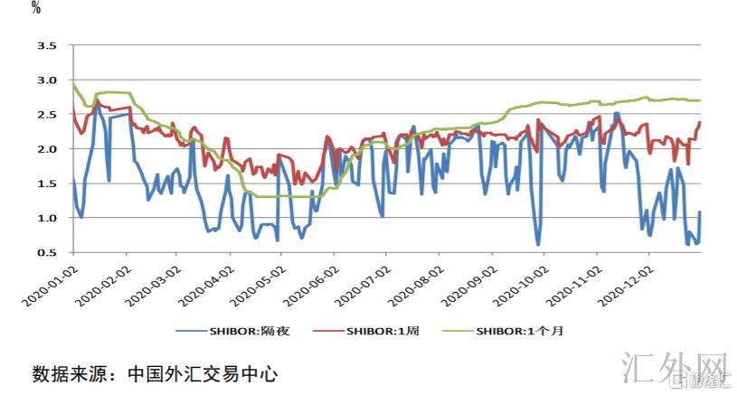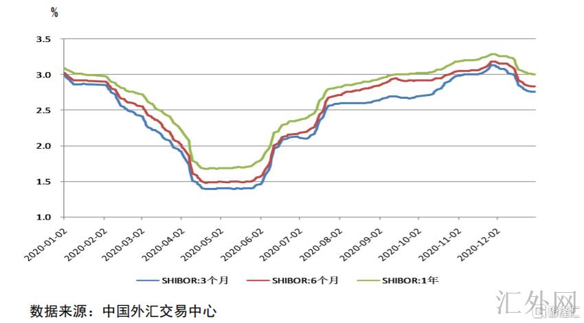 2020年,国内货币市场人民币利率中枢总的先降后升,5月高达低位后回涨,年底稍有回调。2020年底,隔夜、7日、1个月、3个月、6个月和1年期的上海银行间同业拆放利率(SHIBOR)分别较年初下滑35 个、5 个、20 个、24 个、18 个、9 个基点,收盘在1.09%、2.38%、2.70%、2.76%、2.84%、 3.00%。