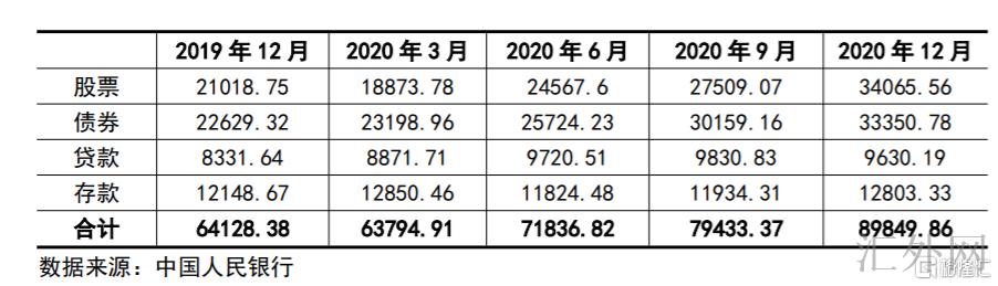 截到2020年底,国外主体持有国内人民币股票、债券、贷款以及存款等金融资产金额合计为8.98万亿元,同比上涨40.1%。其中,股票市值3.41万亿元,债券托管余额3.33万亿元,存款余额1.28万亿元,贷款余额0.96万亿元。