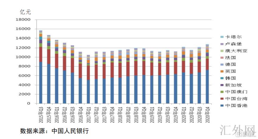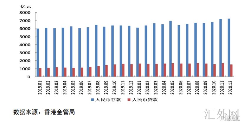 2020年,离岸人民币存款稳中有升。2020年底,首要离岸市场人民币存款余额胜过1.27万亿元。其中,中国香港人民币存款余额为7209.00亿元,在各离岸市场中排名第一名,同比上涨14.2%,占中国香港全部存款余额的5.9%,占其外币存款的11.9%。中国台湾地区人民币存款余额2440.89亿元,在各离岸市场中排名第二位,同比下滑 6.5%;占中国台湾地区全部存款的2.7%,占其外币存款的 9.8%。英国人民币存款余额645.60亿元,在各离岸市场中排在第三名。