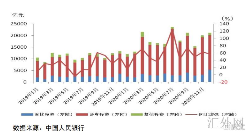 2020年,证券投资者民币跨境收付金额合计为16.50万亿元,同比上涨73.6%,净流入5783.85亿元。