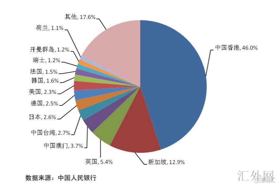 2020年,中境内地与中国香港地区的人民币跨境收付金额占到跨境收付总额的46.0%,占比最高,排在第二至第四名的,分别是与新加坡占比为12.9%,与英国占比为 5.4%,与中国澳门占比为 3.7%。中国香港、新加坡、英国、中国澳门、中国台湾等经济体收付金额占比较上年均有所上涨。