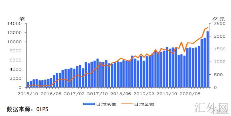 图10:2015到2020年CIPS日均处理跨境人民币业务笔数和金额