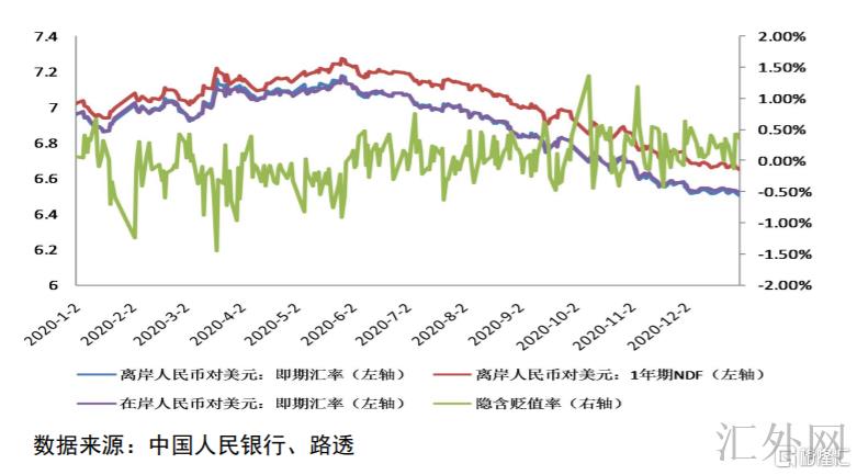 2020年,离岸人民币汇率双向震荡特质显著,与在岸人民币汇率行情差不多统一,离岸、在岸汇差总的平稳。2020年上半年,离岸人民币汇率整体走贬,最低为7.17;下半年离岸人民币汇率渐渐上升,年底收盘在 6.50,较上年底增值 7.1%。1 年期无本金交割远期(NDF)报价总的走升,全年增值 5.6%,隐含贬值率年内呈双向震荡,年底为0.4%,较年初上涨30个基点。离岸人民币汇率年内好于或差于在岸人民币汇率的交易日天数大差不差相当。全年离岸在岸日均汇差为114个基点,较2019年扩大11个基点。