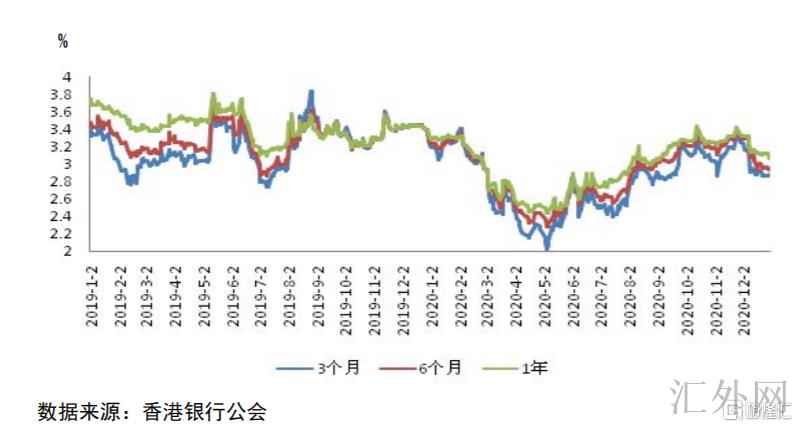2020年迄今,离岸人民币利率总的平稳,各期限分裂趋于显著,短时间限利率震荡程度放大,长期限利率总的回调。2020年底,香港银行同业人民币拆借利率(HIBOR)隔夜和7日期拆借定盘利率分别为 4.03%、2.96%,分别较上年底上涨210和56个基点;3个月、6个月和1年期利率分别为2.88%、2.94%和 3.07%,分别较2019年底下滑38、34 和28个基点。
