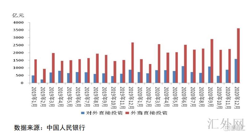 2020年,直接投资者民币跨境收付金额合计为3.81万亿元,同比上涨37.1%。2020 年,对外直接投资者民币跨境收付金额1.05万亿元,同比上涨39.1%;外商直接投资者民币跨境收付金额2.76万亿元,同比上涨36.3%。