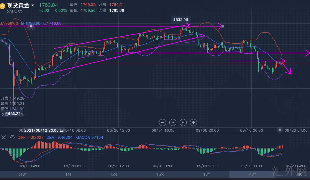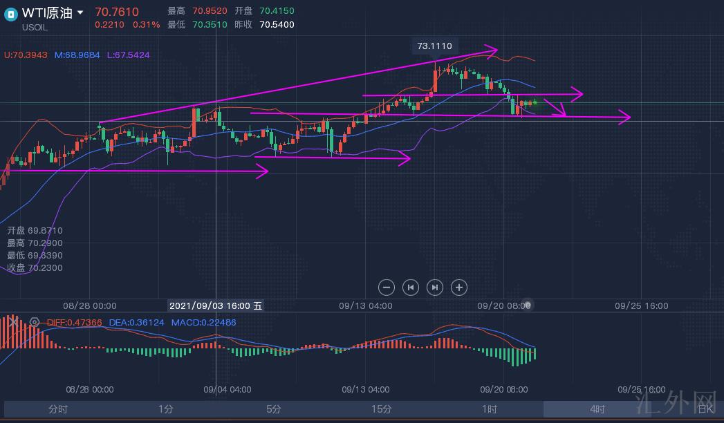 原油层面、原油从上星期三开始刷新73.1左右连续震荡回调,高位逐渐下探,昨日朝下击穿71.2和70核心支撑预示原油正式步入调动。前期受于飓风影响刺激油价上升,但最终对油价影响核心还看OPEC及非OPEC产油国对原油上涨,所以原油调动走回调机会比较大。当前上方阻力70.8以及71-71.1可以执行分批空的方式布局以下持续看69.8左右。