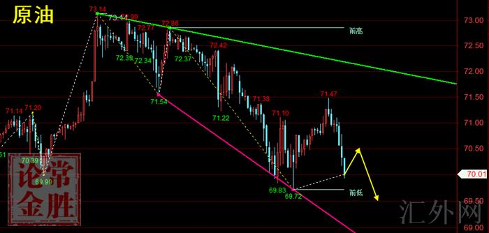 原油从技术行情来说,原油整体处在下挫Y浪当中。当前依照预计在运行Y-2浪,日间并没有显现像样的回踩,从次级别来说也已经迈出下探结构,所以逢高买跌思路总体依旧占优的,当前价格已经到了黄金分割50.0%一线,小时级别已经显现了滞涨信号,夜里等候价格回弹又一次试探这一线的阻力,滞涨不破,斟酌空单介入。参考点位71.50一71.40买跌,风控点放置72.0上方,计划位目睹69~69.5名置。