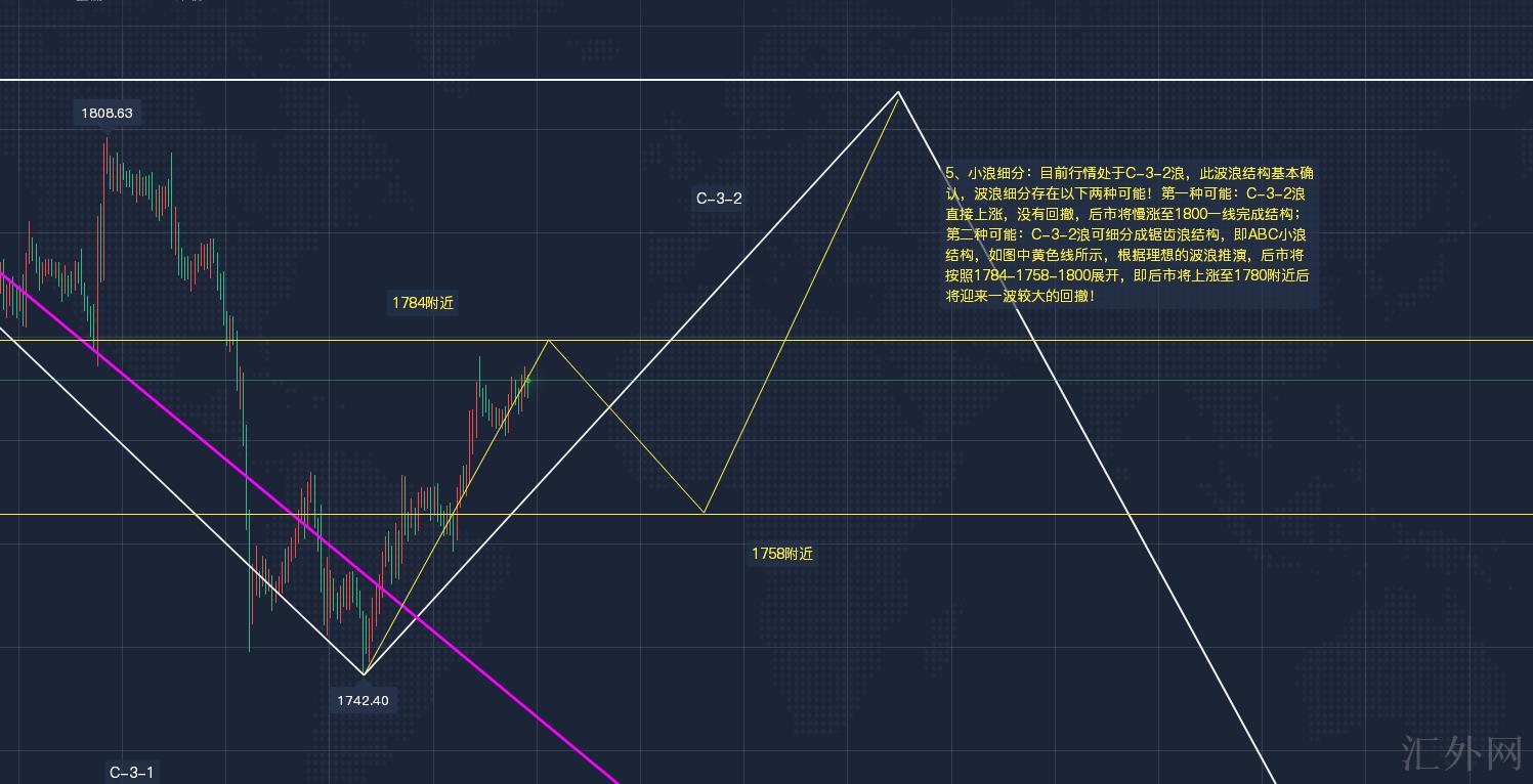 4、小浪细分:当前行情处在C-3-2浪,此波浪结构差不多证实,波浪细分存在下方两种或许!第一种或许:C-3-2浪直接上升,没有回撤,后市将慢涨到1800一线完成结构;第二种或许:C-3-2浪可细分成锯齿浪结构,即ABC小浪结构,如图中黄色线所示,依据理想的波浪推演,后市将依照1784-1758-1800展开,即后市将上升到1780左右后将面临一次较大的回撤!