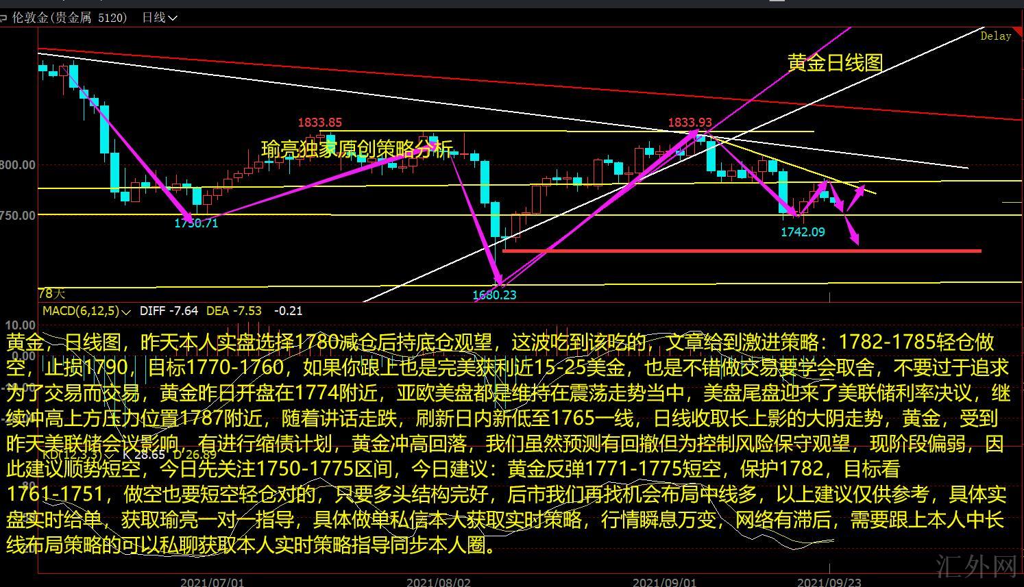 黄金,日K图,昨天本人实盘选择1780减仓后持底仓观望,这段吃到该吃的,文章给到激进策略:1782-1785轻仓买跌,止损1790,计划1770-1760,假使你跟上也是完美获利差不多15-25美金,也是不错做交易要学会取舍,不要过于追求为了交易而交易,黄金昨日开盘在1774左右,亚欧元兑美元盘均为保持在震荡行情当中,美盘收盘面临了美联储利率会议,持续冲顶上方阻力位置1787左右,伴随发言走跌,创下日间新低到1765一线,日K线收取长上影的大阴行情,黄金,承受昨天美联储会议影响,有执行缩债规划,黄金冲顶回调,我们尽管预期有回撤但为控制风险保守观望,现阶段偏空,所以推荐顺势短空,今日先注意1750-1775区间,今日推荐:黄金回弹1771-1775短空,保护1782,计划看1761-1751,买跌也要短空轻仓对的,只要买方结构完好,后市我们再找机会布局中线多,以上推荐仅供参考,具体实盘实时给单,获取瑜亮一对一指导,具体做单私信本人获取实时策略,行情瞬息万变,网络有落后,需求跟上本人中长线布局策略的可以私聊获取本人实时策略指导同步本人圈。