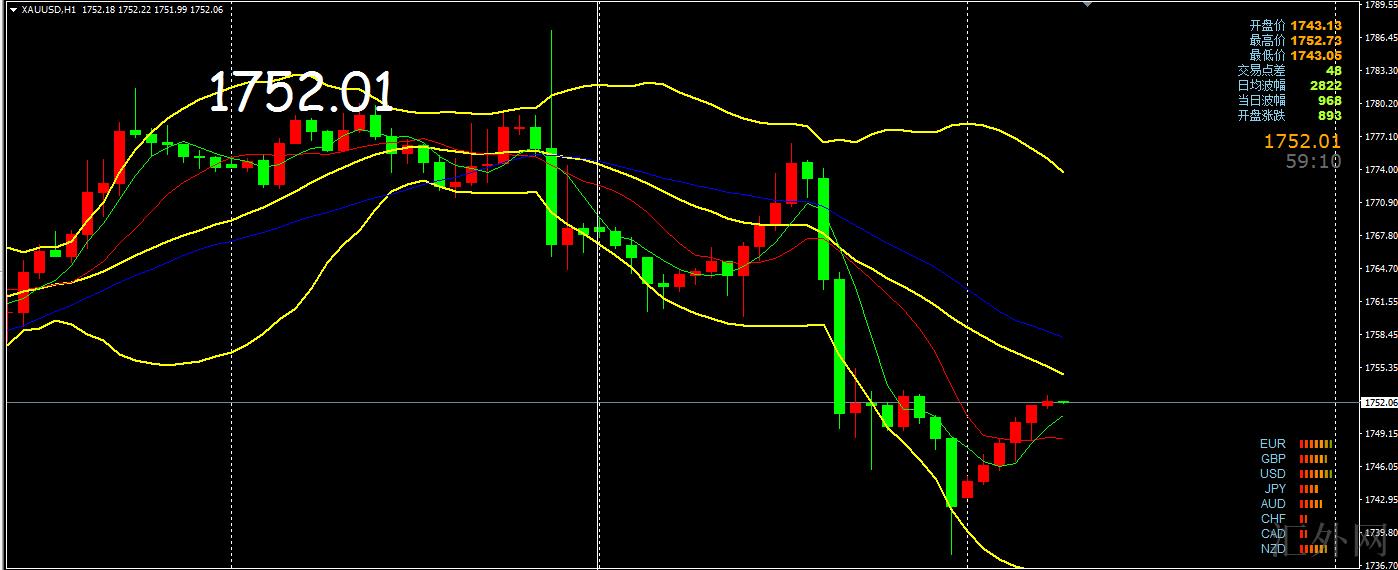 黄金现货低点盘整,现报得1752美元每盎司,支撑阻力位高空低多,阻力位1770-1773,支撑点1737.