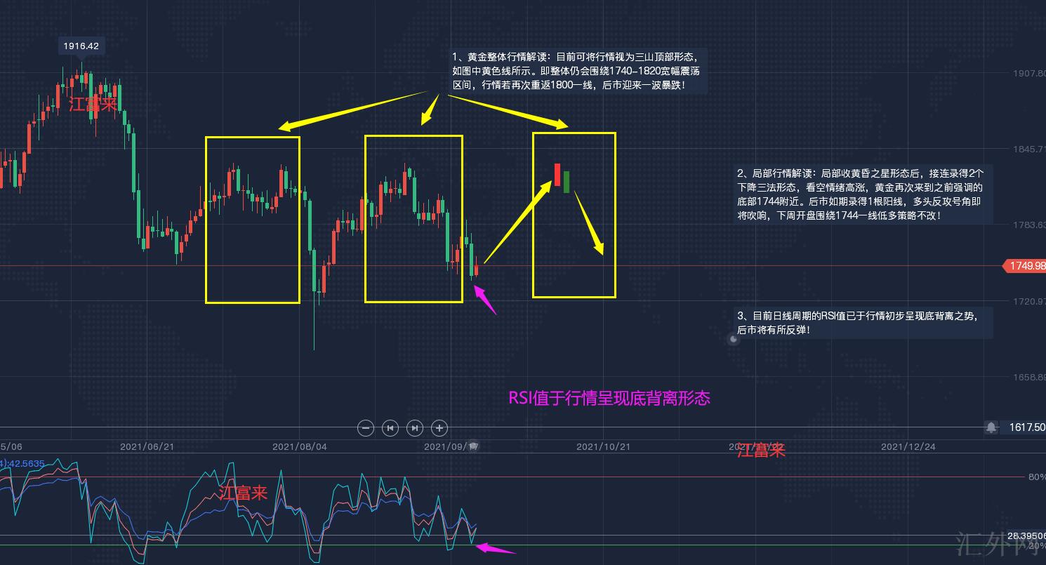 1、黄金整体行情注解:当前可将行情看为三山顶部形态,如图中黄色线所示。即整体仍会环绕1740-1820宽幅震荡区间,行情若又一次重回1800一线,后市面临一次痛跌!