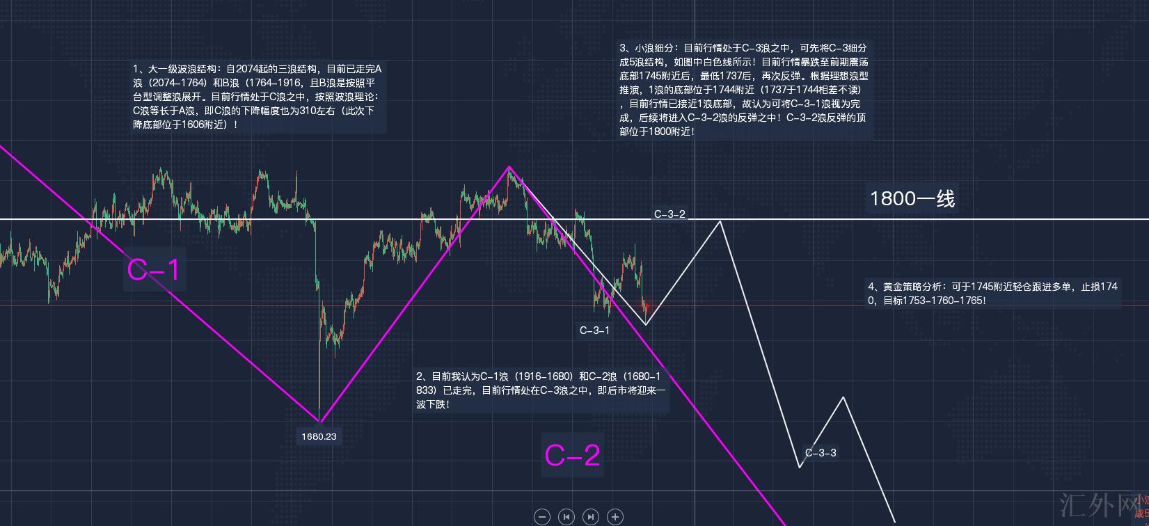 3、小浪细分:当前行情处在C-3浪当中,可先将C-3细分成5浪结构,如图中白色线所示!当前行情痛跌至前期震荡底部1745左右后,最低1737后,又一次回弹。依据理想浪型推演,1浪的底部位于1744左右(1737于1744相差不读),当前行情已接差不多1浪底部,故觉得可将C-3-1浪看为完成,后续将进入C-3-2浪的回弹当中!C-3-2浪回弹的顶部位于1800左右!