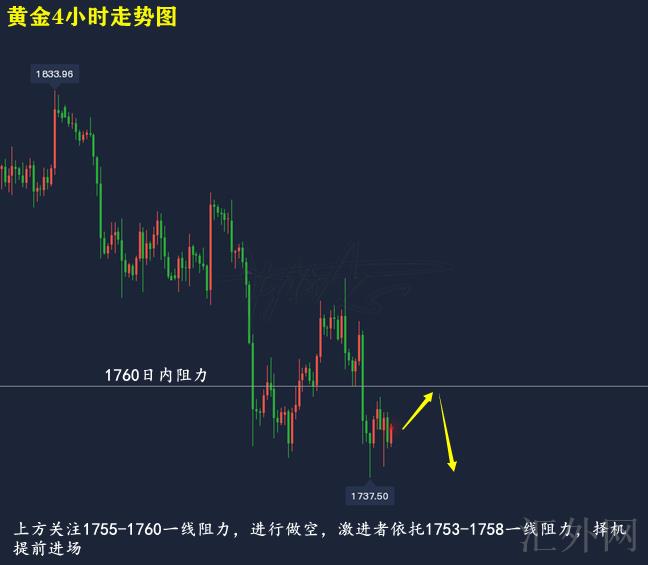 黄金技术分析来分析,日K线上,星期五黄金遇阻于MA5日移动均线展开下探,并在创下日间低点后回涨,盘中报得带上影线的中阳,日K线上,即使黄金打破连阴下探,但上方抑制仍未突破,仍有下探的机会性;4小时上,星期五黄金展开亚盘展开回涨,并遇阻于MA10日移动均线后回调,短线失守下缘后又一次回涨,目前布林带处在开口期,MA均线三线朝下,KDJ随机指标三线往上,MACD指标绿色量能柱开始缩量,快慢线死叉朝下,综合来说,黄金当前上方抑制依旧较强,仍有下探机会,下星期一推荐持续维持买跌,上方注意1755-1760一线压力,激进派可依托1753-1758一线压力,择机提早进场。