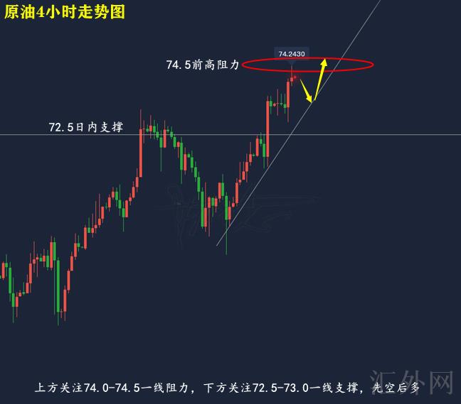 原油技术分析来分析,日K线上,星期五原油保持前几个交易日上涨趋势,又一次依托MA5日移动均线展开上升,盘中报得中阳,日K线上,受于行情仍未打破前高,仍有短时间回撤需求,或又一次摸底回涨;4小时上,星期五原油行情持续呈阶梯式上涨,盘中持续依托MA10日移动均线上升,目前布林带处在开口期,MA均线三线往上,KDJ随机指标三线向前,到达超买,MACD指标红色量能柱开始缩量,快慢线金叉往上,综合来说,原油当前面对前期高位,恐会短时间回撤后又一次上涨,下星期一交易参考先空后多执行操作,上方注意74.0-74.5一线压力,以下注意72.5-73.0一线支撑。