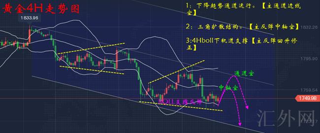 1:4小时BOLL的下缘道支撑1740左右,指标横向运行,盘面假使买方支撑有效,则是需求一根大阳线持稳1765的位置;假使不能回涨1765的位置,则盘面依旧是卖方控盘为主的行情。在通道中,临时是下滑通道,下滑通道主空次多;分界线是1740的位置,所以,我们可以得出两个结论“第一跌穿1740,大阴线跌穿,有一个顺势的突破空单跟进;第二黄金要从新回归买方控盘,则是需求持稳1765的位置,第三,在4小时的通道中依旧下滑通道中的三角扩散结构,是比较复杂的”如下图所示:已经标注了3个转折点,一个是通道空,一个是扩散中轴空,一个是4小时的轨道多;这个选择如何,看下星期一开盘再说