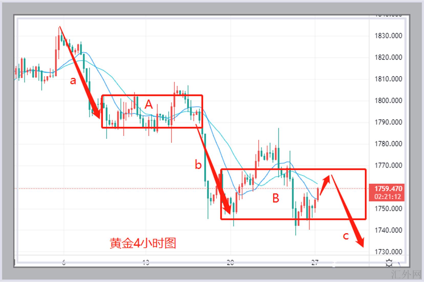 在探讨行情演变以前,先跟大家聊聊我对黄金上星期五跌向1740左右的观点。上星期五黄金没能创新低,1小时K线也形成了下影线,短线来说就是到底信号,面对着一波回弹上升,至于说是大的反转依旧构筑中枢B的一部分,当下并没有办法证实。