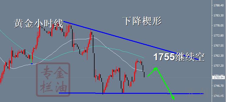 黄金小时线也是明摆着下跌趋势趋势,阴线持续下探,一步步逼差不多1745一线,这也是强劲的支持点,突破了直接奔着1730去,50均线直接盖着k线,直接就是摁在水里了,k线直接下沉了,空,回弹1755持续空