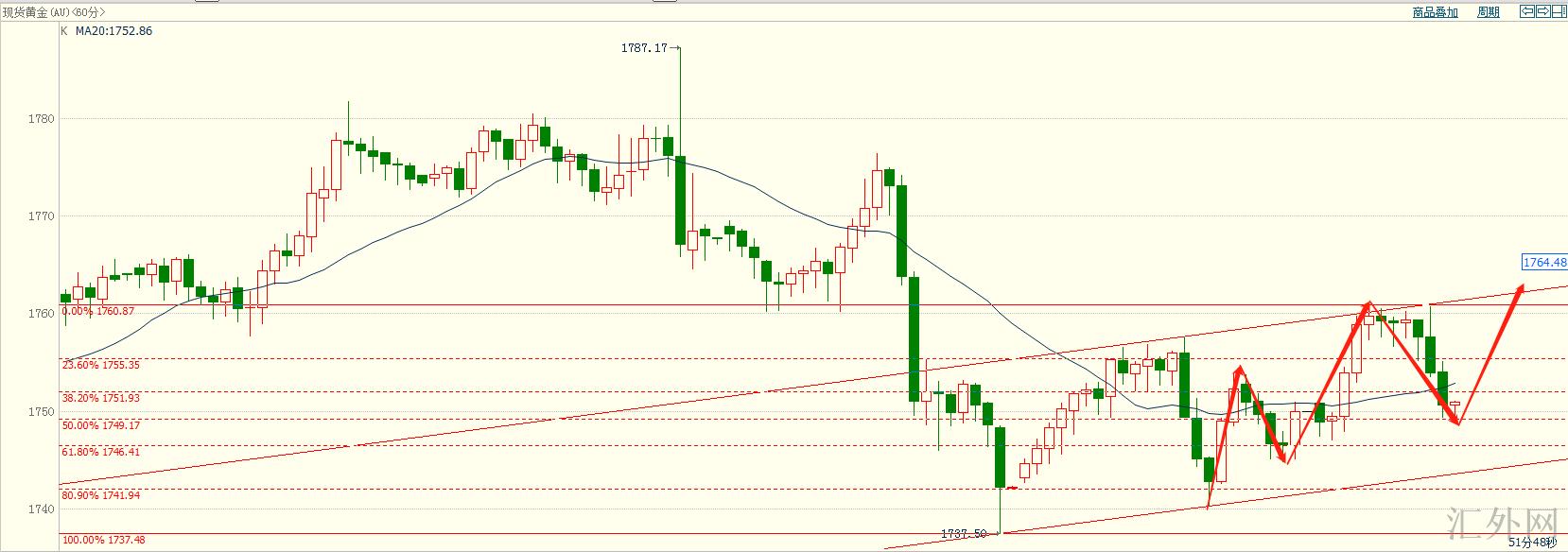 黄金历经的下挫后面当前进入了回弹周期,在回弹的过程中价格运行的依旧异常漂亮,迈出上涨的通道行情,日间受制于通道上沿的抑制价格造成回调,但是值得指出的是在通道内迈出上涨结构,那么有上涨结构的显现,代表着对应的有买涨机会的造成,当前价格已经回调至黄金分割50.0%的位置,是一个多单的优势区,美盘时段推荐等候价格回调到1749~1750一线多单介入,风控点放置1745以下,计划位目睹1758~1760。(博易大师报价,鑫顺波浪理论)图片是黄金2小时图