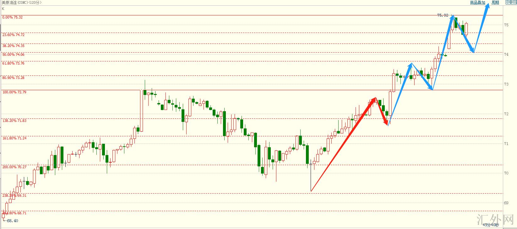 原油从日K线和周线的K线形态来说,处在买方的趋势当中,短时间推荐依旧以逢低买涨为主。价格在75.3一线遇阻回调,日间震荡75个点程度较小,并没有理想的进场点位。今天早盘阶段跳空高开,夜里有机会回补跳缺口口。从波浪结构来说,处在比较规律的助推上升当中,夜里规划价格回调至黄金分割50.0%一线,斟酌多单进场。参考点位74.00~73.90买涨,风控点放置73.5以下,计划位目睹74.80~75.0。(博易大师报价,鑫顺波浪理论)图片是原油2小时图。