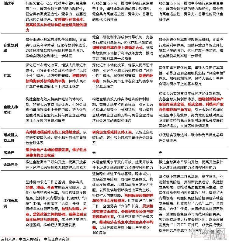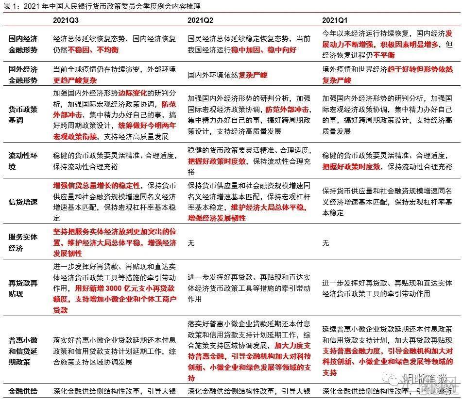 一类是最近各个方面和途径放出出的货币政策信号,包含(1)新添了7月30号政治局会议提议的“统筹做好今明两年宏观政策衔接”的表述,(2)新添了8月23号货币信贷事态分析座谈会和9月23号中央银行电视会议提议的“加强信贷总量上涨的平稳性”内容,(3)新添了二季度货币政策实施数据提议的“有序助推碳减排支持工具落地生效”表述;另一类是三季度货币政策委员会例会第一次提议的,包含(4)新添“坚持把服务实体经济放到愈加突出的位置”的表述,(5)第一次提议“维护房地产市场的健康发展,维护住房消费者的合法权益”,(6)新添“增强与财政、产业、监管政策之间的协调”表述,(7)新添“统筹金融支持实体经济与防风险”表述。