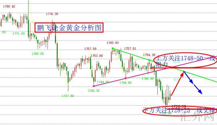 黄金先连续窄幅震荡,欧盘时段受美元再次上升影响,黄金显现一次较大程度回调,跌穿前低1737一带,低位跌向1728左右,此位刚好落在小时图级别的短线趋势线上。