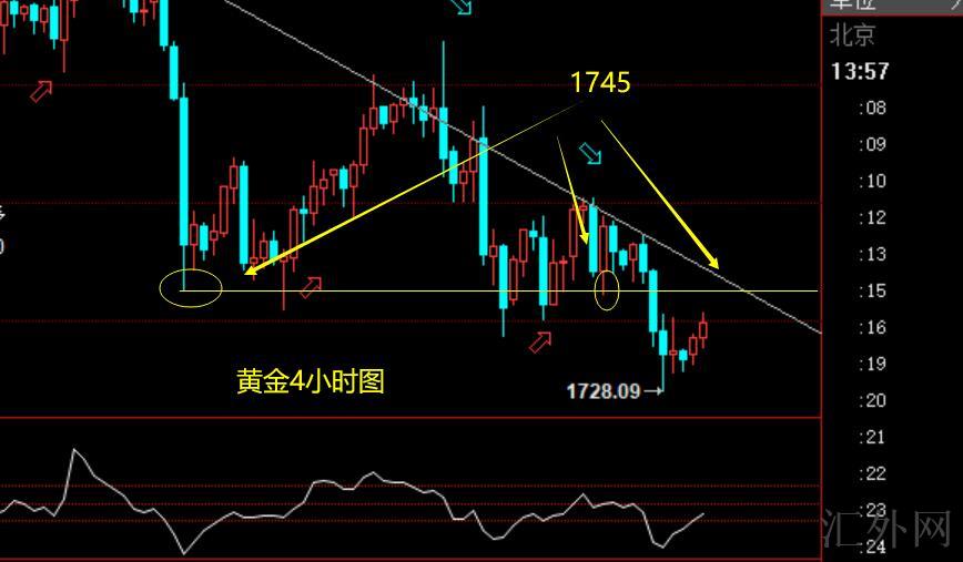 第二:日K线上大阴收尾依旧有卖方的保持,均线层面任然是卖方排列,4小时图下滑通道完好运行,上方阻力关注斐波那契黄金分割50%1745,阻力在1740-45区域空。